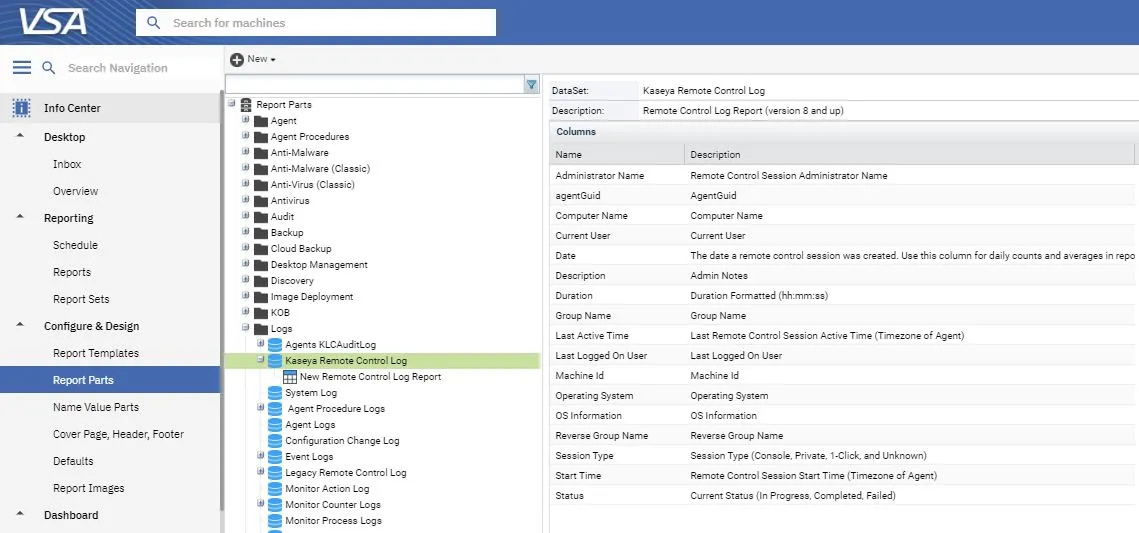 The datasets are structured by VSA categories, including Agent, Agent Procedure, Audit, Discovery, Lan Cache, Monitor, Patch, Remote Control, Service Desk, Software Deployment, Software Management, System, Antimalware, Antivirus, Cloud Backup and Ticketing.
