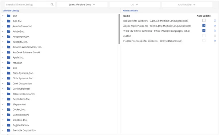 When adding a new software 2.0 profile, there is a new “auto update” column that enables the auto-updating functionality with the click of a button. Once enabled, “auto update” will appear next to the version to clearly identify which 2.0 titles have auto update enabled. In addition, the 2.0 Software Catalog now includes custom update channels for Microsoft Office with current, monthly and semi-annual frequency options.