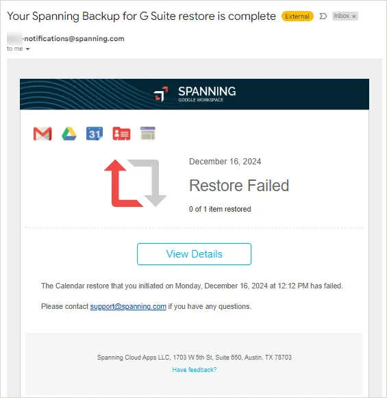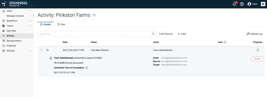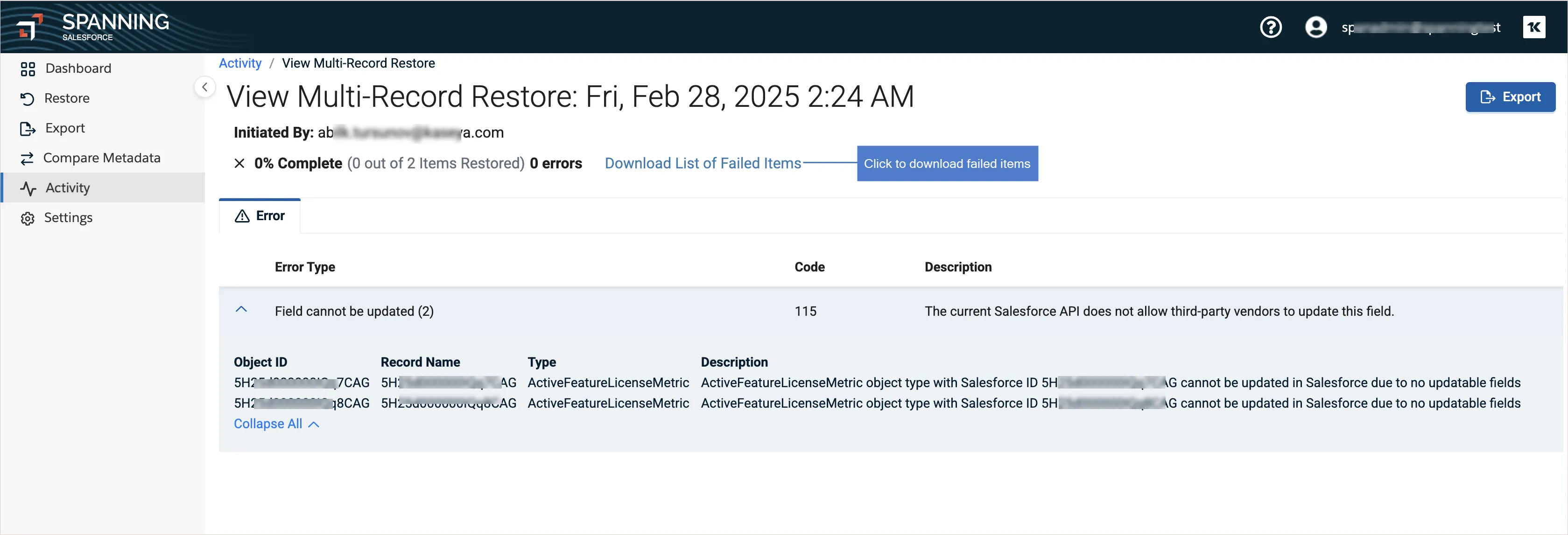 If fields cannot be restored due to Salesforce rules (e.g., the fields are non-creatable or non-updatable), Spanning now skips these fields rather than failing the restore. Skipped fields can be viewed in the “Activity log.”