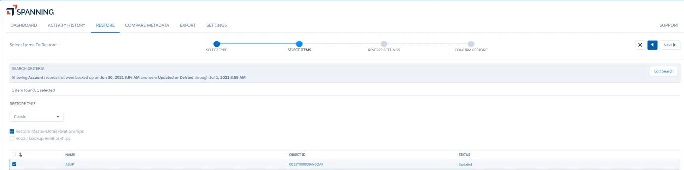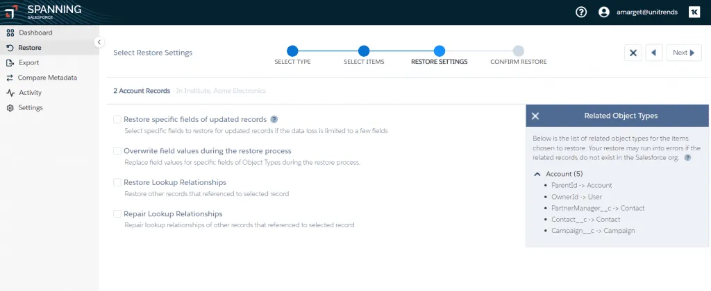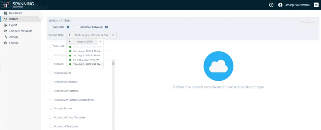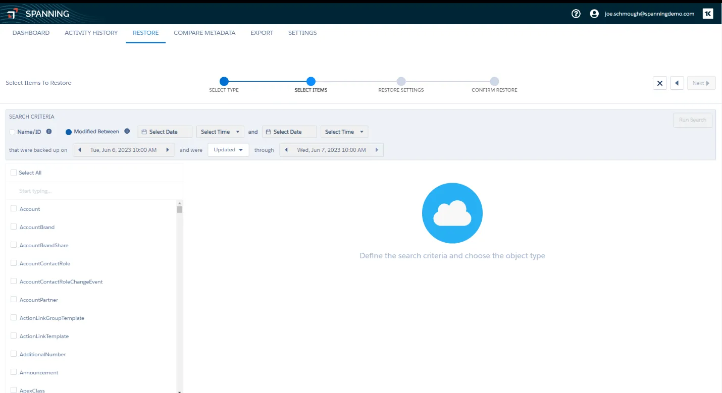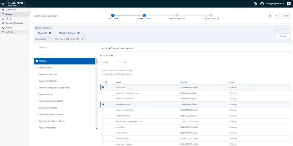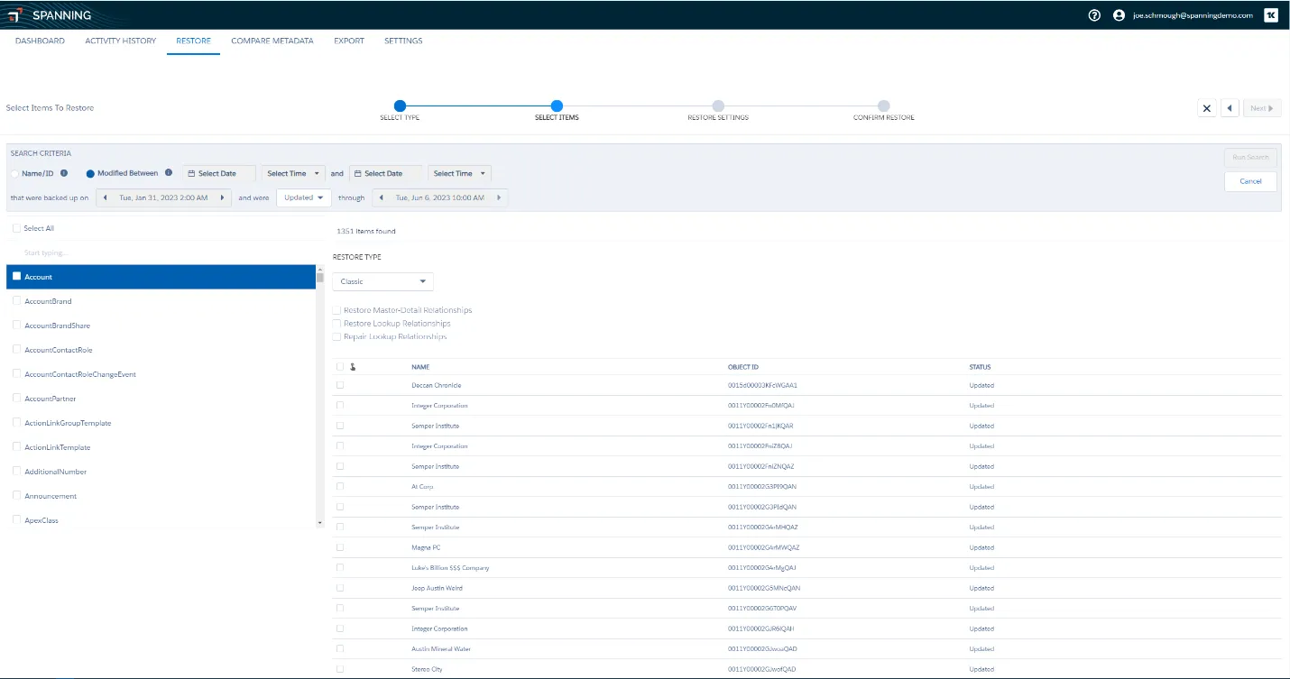 With this functionality, you can easily access the state of your Salesforce environment at specific points in time across your various backups. You can run restores or exports based on Object Type, including granular selections. For example, you might choose to export a subset of Accounts rather than all Accounts from a given point in time.