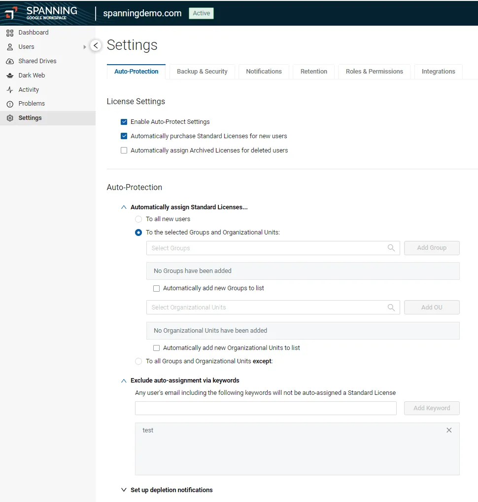 Figure 1. Configure automated license assignment from Spanning Settings.