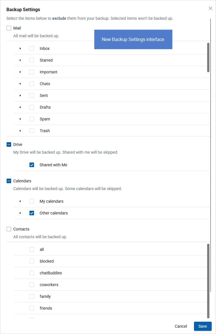 Exclude items from backup: You can now easily specify which items (Mail labels, Drives, Calendars, or Contacts group) to exclude from a user’s backup.