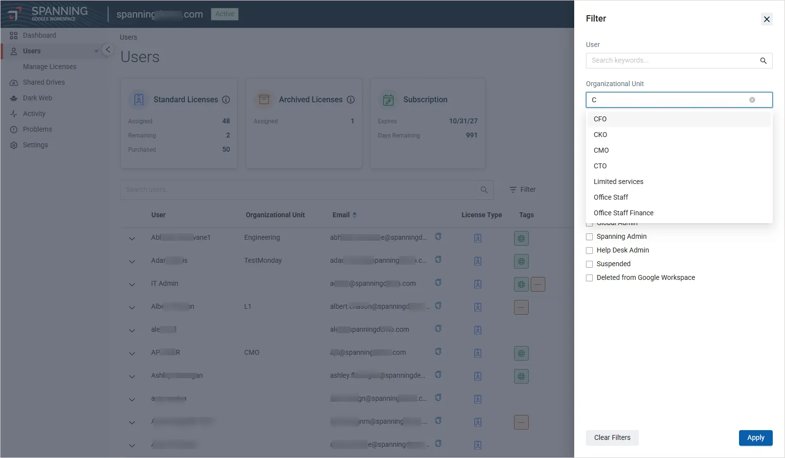 Spanning’s Automated License Assignment feature simplifies the process of managing backup licenses across different departments, locations or groups. With this new feature, Spanning Backup allows admins to automatically assign backup licenses to users based on their Google OUs or Groups memberships. This automation drastically reduces the manual workload during onboarding and throughout the user lifecycle management, ensuring that every new user or employee is backed up from day one.