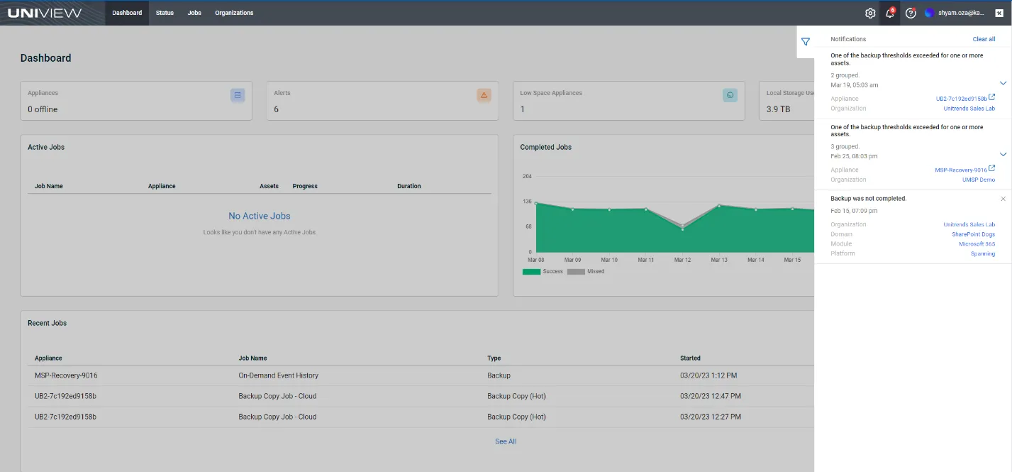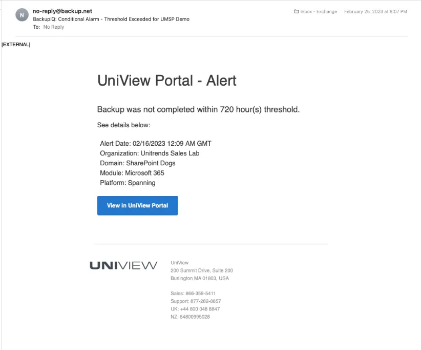 New to UniView? It’s free! Contact your Account Manager to get started. For details on using BackupIQ alerts, see “Working With Your BackupIQ Integration” in the Spanning Backup Guide. You’ll gain access to all kinds of killer new features and integrations, such as conditional alerts or alarms, email alerts, intelligent ticketing and protected workloads status tracker.