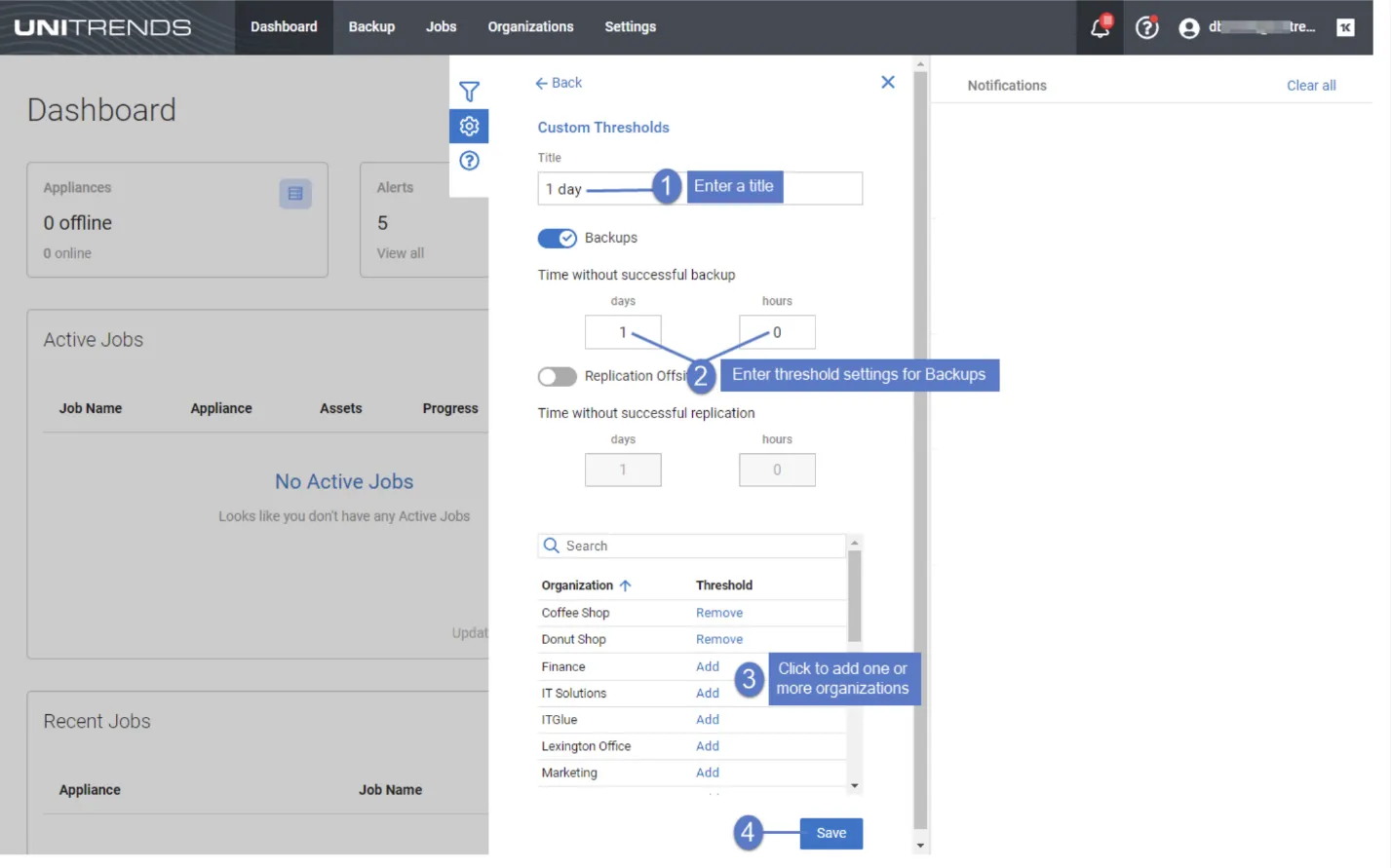 Thresholds can be defined globally or granularly at an organization level. This is very valuable if you have different RPO targets and expectations across your organizations and customers.